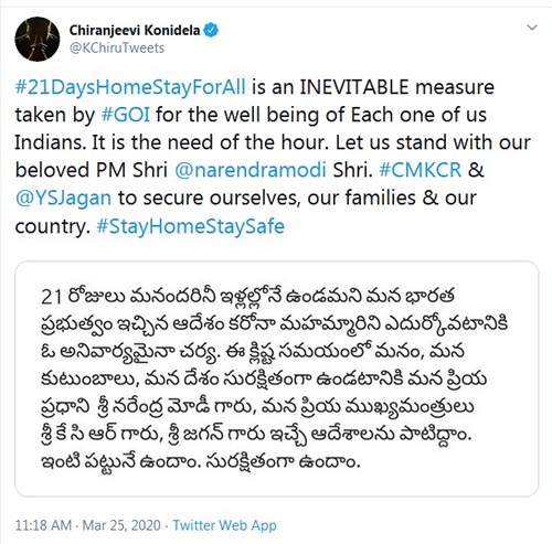రెండో ట్వీట్లో 21 రోజులు మనందర్నీ ఇళ్లల్లోనే ఉండమని భారత ప్రభుత్వం ఇచ్చిన ఆదేశం ఒక అనివార్యమైన చర్య అని పేర్కొన్నారు. మన కుటుంబాలు, మన దేశం సురక్షితంగా ఉండటానికి భారత ప్రధాని నరేంద్ర మోదీ, తెలంగాణ సీఎం కేసీఆర్, ఆంధ్రప్రదేశ్ సీఎం వైఎస్ జగన్మోహనరెడ్డి ఇచ్చిన ఆదేశాలను పాటిద్దామని చెప్పారు. ఇంటిపట్టునే సురక్షితంగా ఉందామన్నారు. తెలుగు, ఇంగ్లీష్.. రెండు భాషల్లో ఈ ట్వీట్లు చేశారు.