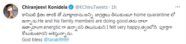 ‘‘కాసేపటి క్రితం తారక్ తో మాట్లాడాను.అన్ని జాగ్రత్తలు తీసుకుంటూ హోం క్వారంటైన్లో ఉన్నారు. ఆయన, ఆయన కుటుంబ సభ్యులు క్షేమంగా ఉన్నారు. తను చాలా ఉత్సాహంగా, ఎర్జిటిక్గా ఉన్నారని తెలుసుకుని సంతోషపడ్డాను. త్వరలోనే పూర్తిగా కోలుకుంటారని ఆశిస్తున్నాను. గాడ్ బ్లెస్ తారక్’’ అంటూ చిరంజీవి తన ట్విట్టర్ హ్యాండిల్ ద్వారా స్పందించారు.
