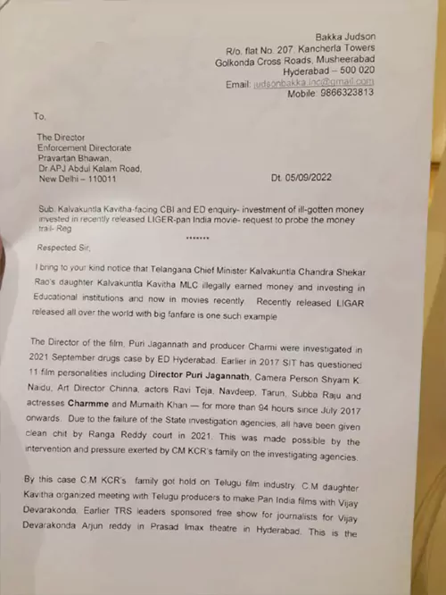 మూలిగే నక్క తాటికాయ పడ్డట్టుగా.. భారీ అంచనాలతో విడుదలై బొక్క బోర్లా పడ్డ 'లైగర్' మూవీ రోజూ ఏదో ఒక రకంగా వార్తల్లో నిలుస్తూనే ఉంది. తాజాగా ఈ సినిమాకి పొలిటికల్ రంగు అంటుకుంది. ఈ సినిమాలో తెలంగాణ సీఎం కేసీఆర్ కుమార్తె, ఎమ్మెల్సీ కవిత బ్లాక్ మనీని పెట్టుబడిగా పెట్టారంటూ ఆరోపణలు వినిపిస్తున్నాయి.