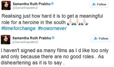 ‘దక్షిణాది చిత్ర పరిశ్రమలో కథానాయికకు అర్థవంతమైన పాత్రలు దొరకడం ఎంత కష్టమో అర్థమైంది. నేను ఎక్కువ సినిమాలకు సంతకం చేయకపోవడానికి గల ఒకే ఒక్క కారణం పాత్రలు మంచివి లభించకపోవడమే. ఇది చెప్పడం చాలా బాధాకరంగా ఉంది’ అని సమంత ట్వీట్ చేశారు. మరి సమంత ఈ వార్తలకు బ్రేక్ వేయడానికి చెప్పారా.. నిజంగానే రోల్స్ రాక ఒప్పుకోవడం లేదా.. సమంతకే తెలియాలి..