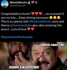 ఈ విషయానికి మరింత బలాన్ని చేకూర్చేలా, విష్ణు కొడుకు 'అవ్రామ్'(Avram)కన్నప్ప లో చిన్నప్పటి తిన్నడి క్యారక్టర్ లో అద్భుతంగా నటించినందుకు, రీసెంట్ గా జరిగిన 'సంతోషం ఫిలిం అవార్డ్స్ 2025 '(Santhosham Film Awards 2025)లో బెస్ట్ చైల్డ్ డెబ్యూ కేటగిరి లో అవార్డు అందుకున్నాడు. ఇందుకు సంబంధించిన వీడియోని విష్ణు తన సోషల్ మీడియా అకౌంట్ 'ఎక్స్' లో షేర్ చేసాడు. సదరు వీడియోని మనోజ్ తన 'ఎక్స్' అకౌంట్ లో షేర్ చేసి 'అవ్రామ్, నువ్వు ఇలాగే ఎదగాలి నాన్నా, ఈ అవార్డుని అన్న విష్ణు, నాన్న మోహన్ బాబు తో అందుకోవడం ఎంతో ప్రత్యేకం. 'లాట్స్ ఆఫ్ లవ్' అనే క్యాప్షన్ ని రాసుకొచ్చాడు. ఇప్పుడు ఈ ట్వీట్ అభిమానుల్లో ఆనందాన్ని ఇస్తుంది. మంచు ఫ్యామిలీ నుండి రెండో తరం నట వారసుడిగా 'కన్నప్ప 'ద్వారా 'అవ్రామ్' తెరంగ్రేటం చేసాడు.