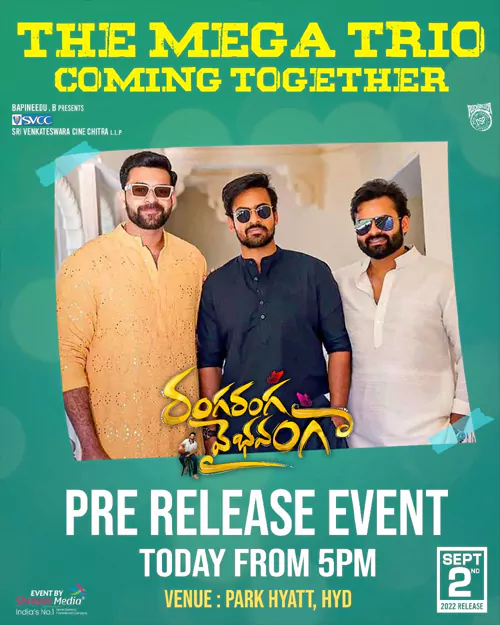 మెగా మేనల్లుడు వైష్ణవ్ తేజ్ హీరోగా గిరీశయ్య దర్శకత్వంలో తెరకెక్కిన సినిమా 'రంగ రంగ వైభవంగా'. కేతిక శర్మ హీరోయిన్ గా నటించిన ఈ చిత్రం సెప్టెంబర్ 2న ప్రేక్షకుల ముందుకు రానుంది. ఎస్వీసీసీ బ్యానర్పై బీవీఎస్ఎన్ ప్రసాద్ నిర్మించిన ఈ మూవీ ప్రీ రిలీజ్ ఈవెంట్ ఈరోజు(ఆగస్ట్ 30) సాయంత్రం జరగనుంది. ఈ కార్యక్రమానికి మెగా హీరోలు వరుణ్ తేజ్, సాయి ధరమ్ తేజ్ చీఫ్ గెస్ట్ లుగా హాజరు కాబోతున్నారు. ఈ సినిమా వైష్ణవ్ కి చాలా కీలకం. మొదటి సినిమా 'ఉప్పెన'తో సంచలన విజయాన్ని అందుకున్న వైష్ణవ్.. రెండో సినిమా 'కొండపొలం'తో నిరాశపరిచాడు. దీంతో 'రంగ రంగ వైభవంగా'తో సాలిడ్ హిట్ అందుకోవాలని భావిస్తున్నాడు. పైగా ఇది పవన్ క్లాసిక్ హిట్ 'ఖుషి' తరహాలో ఉండనుందనడంతో ఈ సినిమాపై మెగా ఫ్యాన్స్ లో మంచి అంచనాలే ఉన్నాయి.