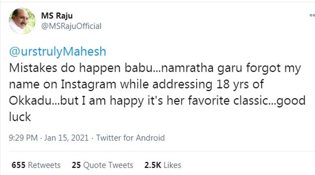 ఎం.ఎస్. రాజు సైతం దీనిపై బాధపడినట్లు కనిపించింది. తన ట్విట్టర్ హ్యాండిల్ ద్వారా పంచుకున్న ఓ ట్వీట్లో మిస్టేక్స్ జరుగుతాయనీ, ఒక్కడు 18 ఏళ్లు పూర్తి చేసుకున్న సందర్భాన్ని పురస్కరించుకొని నమ్రత గారు పెట్టిన పోస్టులో తన పేరును మర్చిపోయారనీ, అయినా ఆ మూవీని ఆమె తన ఫేవరేట్ క్లాసిక్ అని చెప్పినందుకు ఆనందంగా ఉందనీ రాసుకొచ్చారు. ఆ ట్వీట్ను ఆయన మహేశ్కు ట్యాగ్ చేశారు.