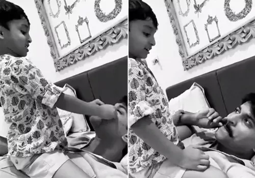 అందులో నాని బెడ్ మీద పడుకొని ఉంటే, అతని ఛాతీపైన కూర్చొని నాన్న మీసాలతో ఆడుకుంటున్నాడు అర్జున్.