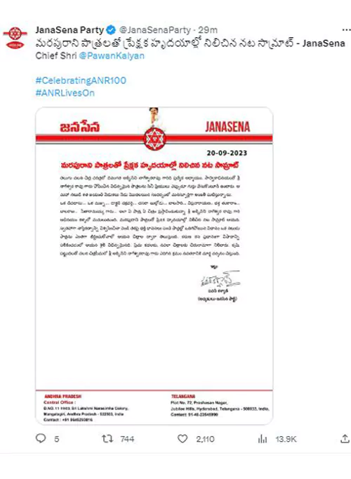 "తెలుగు చలన చిత్ర చరిత్రలో దివంగత శ్రీ అక్కినేని నాగేశ్వరావు ది ప్రత్యేక అధ్యాయం. సాత్వికాభినయంతో శ్రీ నాగేశ్వరరావు పోషించిన విభిన్నమైన పాత్రలను సినీ ప్రియులు ఎప్పుడూ గుర్తు చేసుకుంటూనే ఉంటారు. ఆ మహానటుడి శత జయంతి వేడుకలు నేడు మొదలైన సందర్భంలో మనస్ఫూర్తిగా అంజలి ఘటిస్తున్నాను. ఒక దేవదాసు.. ఒక మజ్ను.. డాక్టర్ చక్రవర్తి.. దసరా బుల్లోడు.. బాటసారి.. విప్రనారాయణ.. భక్త తుకారం.. బాలరాజు.. సీతారామయ్య గారు.. ఇలా ఏ పాత్ర, ఏ చిత్రం ప్రస్తావించుకున్నా శ్రీ అక్కినేని నాగేశ్వరరావు గారి అభినయం కళ్ళలో మెదులుతుంది. మరపురాని పాత్రలతో ప్రేక్షక హృదయాల్లో నిలిచిన నట సామ్రాట్ ఆయన. స్వతహాగా నాస్తికత్వాన్ని విశ్వసించినా వెండితెరపై భక్తి భావనలు పంచే పాత్రల్లో ఒదిగిపోయిన విధానం ఒక నటుడు పాత్రను ఎంతగా జీర్ణించుకోవాలో ఆయన చిత్రాల ద్వారా తెలుస్తుంది. కరుణ రస ప్రధానంగా విషాదాన్ని పలికించడంలో ఆయన శైలి విభిన్నమైనది. ప్రేమకథలకు, నవలా చిత్రాలకు చిరునామాగా నిలిచారు. కృషి, పట్టుదలతో చలన చిత్ర సీమలో శ్రీ అక్కినేని నాగేశ్వరరావు గారు ఎదిగిన క్రమం నవతరానికి మార్గ దర్శనం చేస్తుంది."