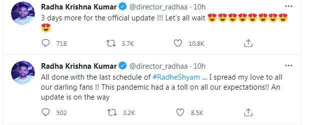 'రాధే శ్యామ్' చిత్రీకరణ పూర్తయిదని డైరెక్టర్ రాధాకృష్ణ ట్వీట్ చేశాడు. ఈ ప్యాండమిక్ మీ అందరి అంచనాలను దెబ్బ తీసింది. కానీ ఓ అప్డేట్ ఇంకో మూడు రోజుల్లో మీకోసం రాబోతోందని పేర్కొన్నాడు. దీంతో ఆ అప్డేట్ ఏంటో అని అందరూ ఎంతో ఆసక్తిగా ఎదురు చూస్తున్నారు. అయితే కొందరు మాత్రం 'మాకు నమ్మకం లేదు దొర' అంటూ ట్రోల్ చేస్తున్నారు.