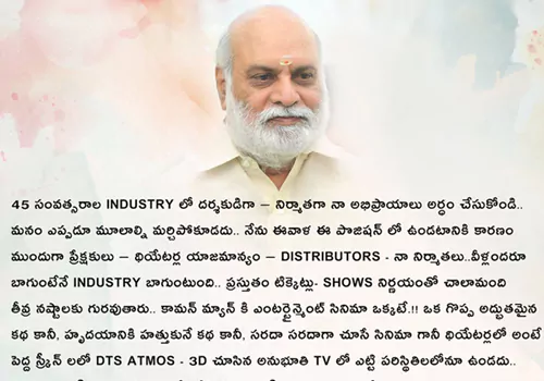 ఇండస్ట్రీలో 45 సంవత్సరాలుగా దర్శకుడిగా, నిర్మాతగా నా అభిప్రాయాలు అర్థం చేసుకోండి. మనం ఎప్పుడూ మూలాల్ని మర్చిపోకూడదు. నేను ఇవాళ ఈ పొజిషన్లో ఉండటానికి కారణం ముందుగా ప్రేక్షకులు, థియేటర్ల యాజమాన్యం, డిస్ట్రిబ్యూటర్స్, నా నిర్మాతలు. వీళ్లందరూ బాగుంటేనే ఇండస్ట్రీ బాగుంటుంది. ప్రస్తుతం టికెట్లు, షోస్ నిర్ణయంతో చాలామంది తీవ్ర నష్టాలకు గురవుతారు. అని ఆవేదన వ్యక్తం చేశారు.