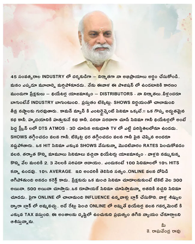 ఆన్లైన్ వలన దోపిడీ ఆగిపోతుందనడం కరెక్ట్ కాదనీ, ప్రేక్షకుడు ఒక మంచి సినిమా చూడాలనుకుంటే టికెట్ వెల 300 అయినా, 500 అయినా చూస్తాడనీ ఆయన బల్లగుద్ది చెప్పారు. ఒక రూపాయికే సినిమా చూపిస్తామన్నా అతనికి నచ్చని సినిమా చూడడు. పైగా ఆన్లైన్లో చాలామంది ఇన్ఫ్లుయెన్స్ వున్నవాళ్లు బ్లాక్ చేసుకుని, వాళ్ల శిష్యుల ద్వారా బ్లాక్లో అమ్మవచ్చు. అదే రేట్లు పెంచి ఆన్లైన్లో అమ్మితే థియేటర్ల వలన గవర్నమెంట్కి ఎక్కువ టాక్స్ వస్తుంది. ఈ అంశాలను దృష్టిలో ఉంచుకొని ప్రభుత్వం తగిన న్యాయం చేకూరుస్తుందని ఆశిస్తున్నాను. అని రాసుకొచ్చారు రాఘవేంద్రరావు.