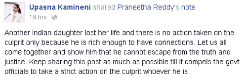 హైదరాబాద్ లో ఇటీవలే మరణించిన ఇంజనీరింగ్ స్టూడెంట్ దేవీ మరణం మిస్టరీ గా మారిన విషయం తెలిసిందే. మొదట ఆమెడి యాక్సిడెంట్ అని అనుకున్నా, ఆ తర్వాత ఆమె మృతిపై ఎన్నో అనుమానాలు ఏర్పడ్డాయి. ఆమెను హత్య చేసి దాన్ని యాక్సిడెంట్ గా చిత్రీకరించే ప్రయత్నం చేస్తున్నారని దేవి కుటుంబ సభ్యులు, స్నేహితులు, విద్యార్ధులు ఆరోపిస్తున్నారు. తాజాగా ఈ సంఘటనపై ప్రముఖ హీరో రామ్ చరణ్ భార్య ఉపాసన కామినేని స్పందించారు. మరో భారత కూతురు ప్రాణం కోల్పోయింది. కానీ నిందితులపై ఎలాంటి చర్యలు లేవు. కేవలం డబ్బు, పలుకుబడి ఉంటే తప్పు చేసి తప్పించుకోవచ్చనుకుంటున్నారు. ఈ కేసులో నిందితులు తప్పించుకోకుండా కలిసి పోరాడాలి. దేవికి న్యాయం జరిగేలా చేద్దాం, నిందితుల్ని శిక్షించే వరకూ పోస్ట్ ను షేర్ చేద్దాం అంటూ తన ఫేస్ బుక్ లో పోస్ట్ చేశారు ఉపాసన. కాగా దేవీ రెడ్డి కేసు రోజురోజుకూ మరింత అనుమానాస్పదంగా మారుతోంది. పోలీసులు రోజుకో వాదన వినిపించడం, ప్రత్యక్షసాక్షులు కథనాలు భిన్నంగా ఉండటంలాంటివి అనుమానాన్ని మరింత బలపరుస్తున్నాయి.