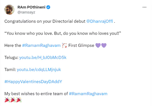 ప్రేమికుల రోజు సందర్భంగా 'రామం రాఘవం' చిత్ర గ్లింప్స్ ను హీరో ఉస్తాద్ రామ్ పోతినేని తన ట్విట్టర్ ఖాతాలో డిజిటల్ విడుదల చేసి చిత్రం పెద్ద విజయాన్ని అందుకోవాలని ఆకాంక్షించారు. అలాగే ప్రముఖ దర్శకుడు హరీష్ శంకర్ మీడియా గ్లింప్స్ ను రిలీజ్ చేసిన అనంతరం మాట్లాడుతూ... ధనరాజ్ నటుడిగా బిజీగా ఉన్నా.. ఒక మంచి కథను ప్రేక్షకులకు చెప్పాలనే ఉద్దేశంతో రామం రాఘవం సినిమాను తీశారు. గ్లింప్స్ చాలా ఆసక్తికరంగా ఉంది. ఎమోషనల్ జర్నీ తో రాబోతున్న ఈ చిత్రం పెద్ద విజయం సాధించాలని కోరుకుంటున్నాను. ప్రేమికుల రోజును తండ్రి కొడుకుల మధ్య ఉన్న బాండింగ్ ను కళ్ళకు కట్టినట్లు చిత్రీకరించిన గ్లింప్స్ విడుదల చెయ్యడం కొత్తగా ఉందని అభిప్రాయ పడ్డారు.