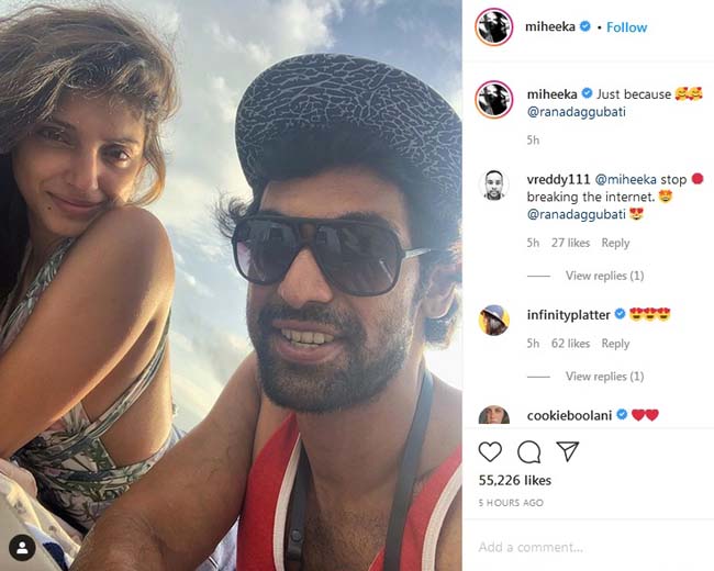 ఆ ఇద్దరూ బీచ్లో ఆహ్లాదంగా గడుపుతున్నట్లు ఆ పిక్చర్ను బట్టి అర్థమవుతోంది. ఆ సెల్ఫీని రానా తీశాడు. ఆ ఫొటోకు "జస్ట్ బికాజ్ రానా దగ్గుబాటి" అనే క్యాప్షన్ జోడించింది మిహీకా. ఆ పిక్చర్లో ఇద్దరూ బీచ్వేర్లో కనిపిస్తున్నారు. తమ హనీమూన్ లొకేషన్ను మిహీకా రివీల్ చేయకపోయినప్పటికీ, పెళ్లి తర్వాత ఆ ఇద్దరూ తొలిసారి కనిపించిన ఫొటోతో ఫ్యాన్స్ ఆనందపడుతున్నారు.