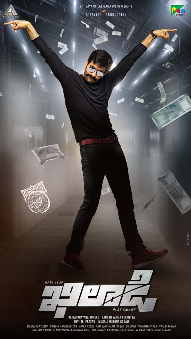 మాస్ మహారాజా రవితేజ హీరోగా, డైరెక్టర్ రమేష్ వర్మ రూపొందించే యాక్షన్ ఎంటర్టైనర్కు 'ఖిలాడి' అనే టైటిల్ ఖరారు చేశారు. ప్రి లుక్ పోస్టర్తో ఆడియెన్స్ను టీజ్ చేసిన చిత్ర బృందం ఆదివారం ఫస్ట్ లుక్ పోస్టర్ను విడుదల చేసింది. టోటల్ బ్లాక్ డ్రస్లో తనదైన స్టైల్ డాన్స్ మూవ్తో ఈ పోస్టర్లో రవితేజ ఆకట్టుకుంటున్నారు. 'ప్లే స్మార్ట్' అనేది ఈ సినిమా ట్యాగ్లైన్. టైటిల్తో పాటు పోస్టర్లో కరెన్సీ నోట్లు ఎగురుతుండటాన్ని బట్టి హీరో క్యారెక్టరైజేషన్ ఎలా ఉంటుందోననే ఇంట్రెస్ట్ క్రియేట్ అవుతోంది.