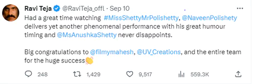 ఇదిలా ఉంటే, తాజాగా 'మిస్ శెట్టి మిస్టర్ పొలిశెట్టి'తో అనుష్క స్వల్ప విరామం తరువాత నాయికగా సందడి చేసింది. నవీన్ పొలిశెట్టితో కలిసి చేసిన ఈ మూవీ.. బాక్సాఫీస్ ముంగిట మంచి వసూళ్ళని రాబడుతోంది. కేవలం ప్రేక్షకులనే కాకుండా మెగాస్టార్ చిరంజీవి, సమంత వంటి ప్రముఖులను సైతం ఈ హిలేరియస్ ఎంటర్టైనర్ రంజింపజేసింది. తాజాగా ఈ లిస్ట్ లో రవితేజ కూడా చేరారు. ఇటీవల ఈ మూవీ చూసిన రవితేజ.. 'మిస్ శెట్టి మిస్టర్ పొలిశెట్టి'ని చూడడం చాలా ఆనందంగా ఉందని, నవీన్ పొలిశెట్టి మరోసారి తన అద్భుతమైన కామెడీ టైమింగ్ తో ఆకట్టుకున్నాడని ప్రశంసించాడు. అలాగే అనుష్క అస్సలు డిజప్పాయింట్ చేయదని కాంప్లిమెంట్ ఇచ్చాడు. అలాగే, దర్శకనిర్మాతలతో పాటు చిత్రబృందానికి ట్విట్టర్ వేదికగా విజయాభినందనలు తెలిపాడు రవితేజ.