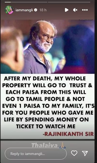 సింగర్ మంగ్లీ గురించి ప్రత్యేకంగా చెప్పక్కర్లేదు. మంగ్లీ ఎక్కడుంటే అక్కడ తన సాంగ్స్ తో ఆడియన్స్ లో జోష్ తెప్పిస్తుంది. పల్లె పాటలు పాడే ఆణిముత్యం అంటారు.. అంతే కాదు..సినిమాల్లో కూడా ఎన్నో సాంగ్స్ పాడింది...నటించింది...డివోషనల్ సాంగ్స్ పాడుతుంది. ఒక్కమాటలో చెప్పాలంటే మంగ్లీ ఆల్ రౌండర్ అన్నమాట. మంగ్లీ సోషల్ మీడియాలో కూడా ఫుల్ యాక్టివ్ గా ఉంటుంది. రీసెంట్ గా ఆమె తలైవా చెప్పిన మాటలకి సంబంధించిన ఒక పోస్ట్ ని తన ఇన్స్టాగ్రామ్ స్టేటస్ లో పెట్టుకుంది. "నేను చనిపోయాక, నా ఆస్తి మొత్తం ట్రస్ట్ కే వెళ్ళిపోతుంది..అందులో ప్రతీ పైసా తమిళ ప్రజల కోసమే వినియోగించబడుతుంది తప్ప నా కుటుంబానికి ఒక్క పైసా కూడా ఖర్చు పెట్టను.. నన్ను ఆదరించి నేను నటించిన సినిమాలు చూడడం కోసం వాళ్ళ డబ్బును ఖర్చు పెట్టారు. అలాంటి వాళ్ళ కోసం నేను ఎంత చేసినా తక్కువే" అని రజనీకాంత్ ఒక సందర్భంలో అన్నారు. ఆయన మాటల్ని ఇన్స్పిరేషన్ గా తీసుకుంటూ ఉంటుంది మంగ్లీ.