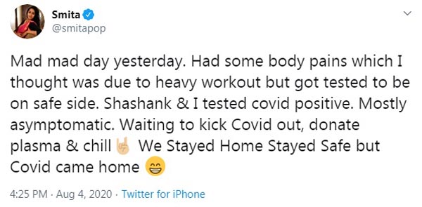 తెలుగులో ఏకైక పాప్ సింగర్గా పేరు తెచ్చుకున్న స్మిత కొవిడ్-19కు గురయ్యారు. టెస్ట్లో ఆమెతో పాటు ఆమె భర్త శశాంక్ కూడా పాజిటివ్గా తేలారు. ఈ విషయాన్ని ఆమె తన సోషల్ మీడియా అకౌంట్ ద్వారా వెల్లడించారు. "Mad mad day yesterday. ఒంటి నొప్పులు రావడంతో అధిక వ్యాయామం వల్ల వచ్చాయేమోనని మొదట అనుకున్నాను. తర్వాత ఎందుకైనా మంచిదని టెస్ట్ చేయించుకున్నాం. శశాంక్, నేను కొవిడ్ పాజిటివ్ అని నిర్ధారణ అయ్యింది. లక్షణాలైతే ఎక్కువగా ఏమీ లేవు. కొవిడ్ నుంచి బయటకు వచ్చాక ప్లాస్మా డొనేట్ చేస్తాం. ఇంట్లో ఉన్నాం.. క్షేమంగా ఉన్నాం.. కానీ ఇంటికి కొవిడ్ వచ్చింది" అని ఆమె ట్వీట్ చేశారు.