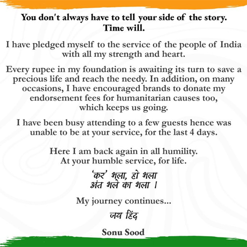 సోమవారం ట్విట్టర్ వేదికగా సోనూసూద్ స్పందించారు. 'అసలేం జరిగిందో అంటూ నీ వాదనను నువ్వు ప్రతిసారి వినిపించాల్సిన అవసరం లేదు.. కాలమే చెబుతుంది' అంటూ సోనూ ఒక నోట్ ను విడుదల చేశారు. "నాకు తోచినంతలో నా దేశ ప్రజలకు సాయం చేయాలని నాకు నేను ప్రతిజ్ఞ చేసుకున్నాను. నా ఫౌండేషన్ లో ఉన్న ప్రతి రూపాయి.. విలువైన జీవితాలని కాపాడటం కోసం, ఆపదలో ఉన్న వారిని ఆదుకోవడం కోసం ఎదురుచూస్తుంది. కొన్ని కారణాల వల్ల గత నాలుగు రోజులుగా అందుబాటులో లేను. మీకు సేవ చేయడానికి మళ్ళీ తిరిగి వచ్చాను. జీవితాంతం నా ఈ ప్రయాణం కొనసాగుతుంది. జై హింద్" అంటూ సోనూ ట్వీట్ చేశారు.