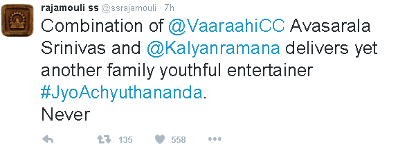 తెలుగు చిత్ర పరిశ్రమ ఎప్పుడెప్పుడా అని ఎదురు చూసిన జ్యోఅచ్యుతానంద ఇవాళ తెలుగు ప్రేక్షకుల ముందుకు వచ్చింది. మార్నింగ్షో చూసొచ్చిన ప్రేక్షకుల నుంచి పాజిటివ్రెస్పాన్స్ వస్తుండటంతో చిత్ర యూనిట్ సంబరాల్లో మునిగిపోయింది. అలాంటి టైంలో మరో కాంప్లిమెంట్ వారిని మరింత ఖుషీ చేస్తోంది. ఆ కాంప్లిమెంట్ ఇచ్చింది ఎవరో కాదు దర్శకధీరుడు రాజమౌళి. ఇండస్ట్రీలో ప్రతిభ ఉన్న వారిని వెన్నుతట్టి ప్రోత్సహించడంలో ఎప్పుడూ ముందే ఉంటారు జక్కన్న. దానిలో భాగంగానే అవసరాల శ్రీనివాస్ దర్శకత్వంలో వచ్చిన జ్యోఅచ్యుతానందను చూసిన రాజమౌళి ఆ సినిమా అద్భుతంగా ఉందంటూ చిత్ర యూనిట్ను పొగడ్తలతో ముంచెత్తారు. వారాహి + శ్రీనివాస్ అవసరాల + కళ్యాణ్ రమణ కాంభినేషన్ మరోసారి ప్రేక్షకులకు ఫ్యామిలీ యూత్ ఫుల్ ఎంటర్టైనర్ ను అందించారని, ఎక్కడ ఓవర్ లేకుండా సినిమా అంతా ఫన్ ఉండేలా, చివరి పది నిముషాలు హృదయానికి హత్తుకునేలా ఉందన్నారు. రాజమౌళి ఒక సినిమాపై పాజిటివ్గా మాట్లాడారంటే అది ఖచ్చితంగా సూపర్హిట్టనే భావన ఇండస్ట్రీలోనూ..ప్రేక్షకుల్లోనూ ఉంది. ఇప్పుడు జ్యోఅచ్యుతానంద విషయంలో జక్కన్న కాంప్లిమెంట్ ఇవ్వడంతో ఇక ఈ సినిమాకు తిరుగే ఉండదని చిత్రయూనిట్ భావిస్తోంది.