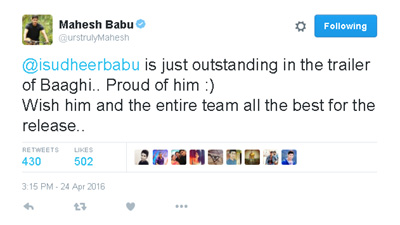 ఈ శుక్రవారం రిలీజవుతున్న బాఘీపై బాలీవుడ్ లో మంచి అంచనాలే ఉన్నాయి. ఈ నేపథ్యంలో సుధీర్ బాబు స్పెషల్ టీజర్ ను చూసి మహేష్ కూడా ఫ్లాట్ అయిపోయారు. సుధీర్ ను చూస్తుంటే తనకు చాలా గర్వంగా ఉందని, ఒక బాలీవుడ్ సినిమాలో ఇలా మన తెలుగువాణ్ని చూడటం చాలా హ్యాపీగా ఉందంటున్నారు మహేష్. మూవీ యూనిట్ కు ఆల్ ది బెస్ట్ చెబుతూ ట్వీట్ చేశారు. బాఘీ రిజల్ట్ ఎలా ఉన్నప్పటికీ, సుధీర్ పెర్ఫామెన్స్ బాగుంటే బాలీవుడ్ లో మరిన్ని అవకాశాలు సంపాదిస్తాడనడంలో డౌట్ లేదు.