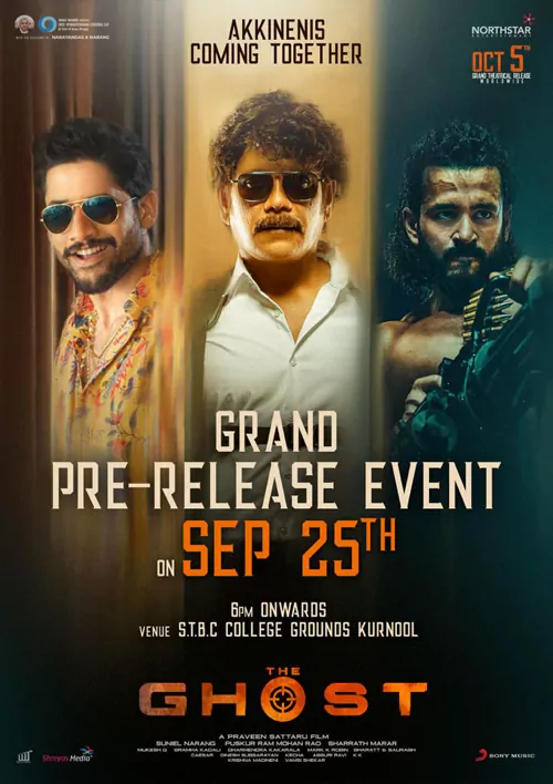 'ది ఘోస్ట్' మూవీ ప్రీ రిలీజ్ ఈవెంట్ సెప్టెంబర్ 25న సాయంత్రం కర్నూల్ లోని ఎస్టీబీసీ కాలేజ్ గ్రౌండ్స్ లో జరగనుంది. ఈ కార్యక్రమానికి నాగార్జున తనయులు యువ హీరోలు నాగ చైతన్య, అఖిల్ హాజరు కాబోతున్నారు. ఇటీవల ఇద్దరిద్దరుగా వేదికను పంచుకున్నారు గాని తండ్రీకొడుకులు ముగ్గురూ ఒకే వేదికపై కనిపించి చాలా రోజులైంది. ఈ ముగ్గురినీ ఒకే వేదికపై చూసుకోవడం అక్కినేని అభిమానులకు కన్నులపండుగ అని చెప్పొచ్చు.