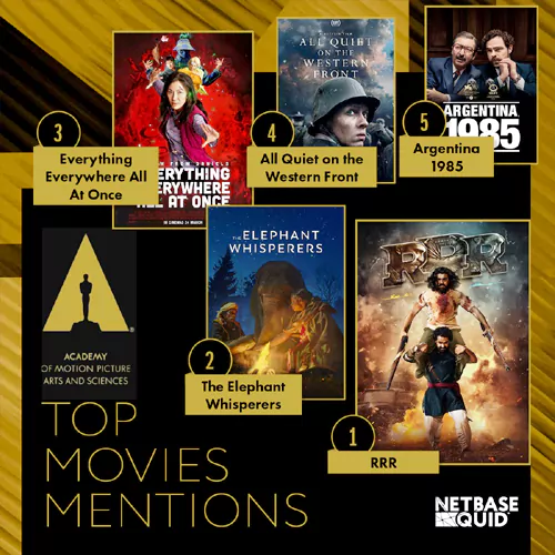 ఆస్కార్ వేడుక సందర్భంగా మీడియా, సోషల్ మీడియాలో అత్యధికంగా మెన్షన్ చేసిన టాప్-5 సినిమాల లిస్టులో 'ఆర్ఆర్ఆర్' చిత్రం మొదటి స్థానంలో నిలిచింది. బెస్ట్ డాక్యుమెంటరీ షార్ట్ ఫిల్మ్ విభాగంలో ఆస్కార్ గెలుచుకున్న ఇండియన్ ఫిల్మ్ 'ది ఎలిఫెంట్ విస్పరర్స్' రెండో స్థానంలో నిలిచింది. ఉత్తమ చిత్రం సహా మొత్తం ఏడు ఆస్కార్ అవార్డులు గెలుచుకున్న 'ఎవ్రిథింగ్ ఎవ్రివేర్ ఆల్ ఎట్ వన్స్'ని సైతం వెనక్కి నెట్టి మొదటి రెండు స్థానాల్లో భారతీయ చిత్రాలు నిలవడం విశేషం.