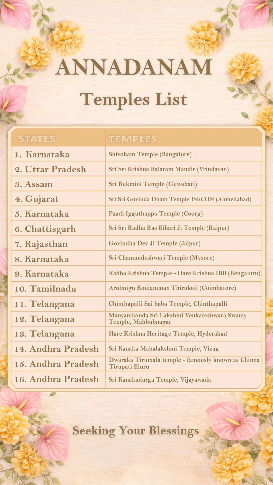 - దేశవ్యాప్తంగా 16 దేవాలయాల్లో అన్నదానం