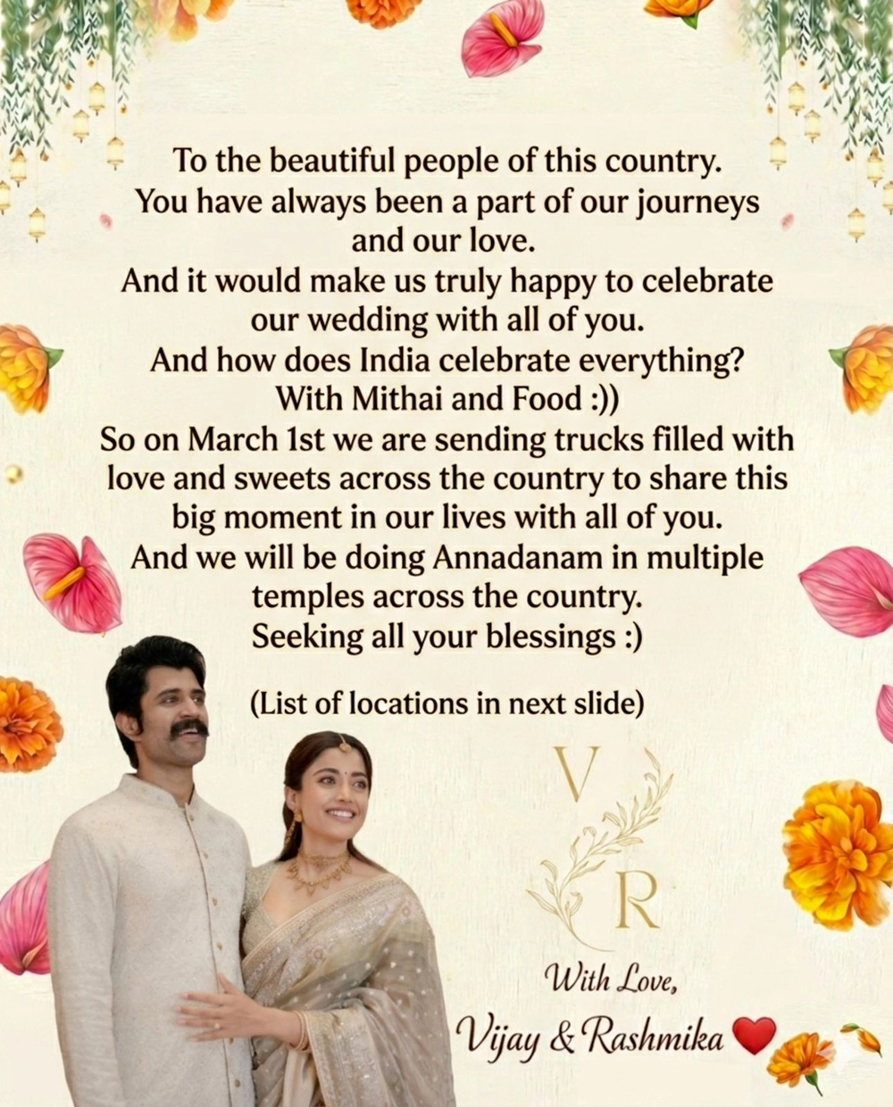 వైవాహిక జీవితంలోకి తాము అడుగుపెట్టిన సందర్భంగా మనస్ఫూర్తిగా ఆశీస్సులు అందించిన దేశ ప్రజలకు కృతజ్ఞత తెలిపారు విజయ్, రష్మిక జంట. వారిపై తమ ప్రేమను చూపించేందుకు దేశవ్యాప్తంగా వివిధ నగరాల్లోని దేవాలయాల్లో అన్నదానం, స్వీట్స్ పంపిణీ చేస్తున్నట్లు విరోష్ ప్రకటించారు.
