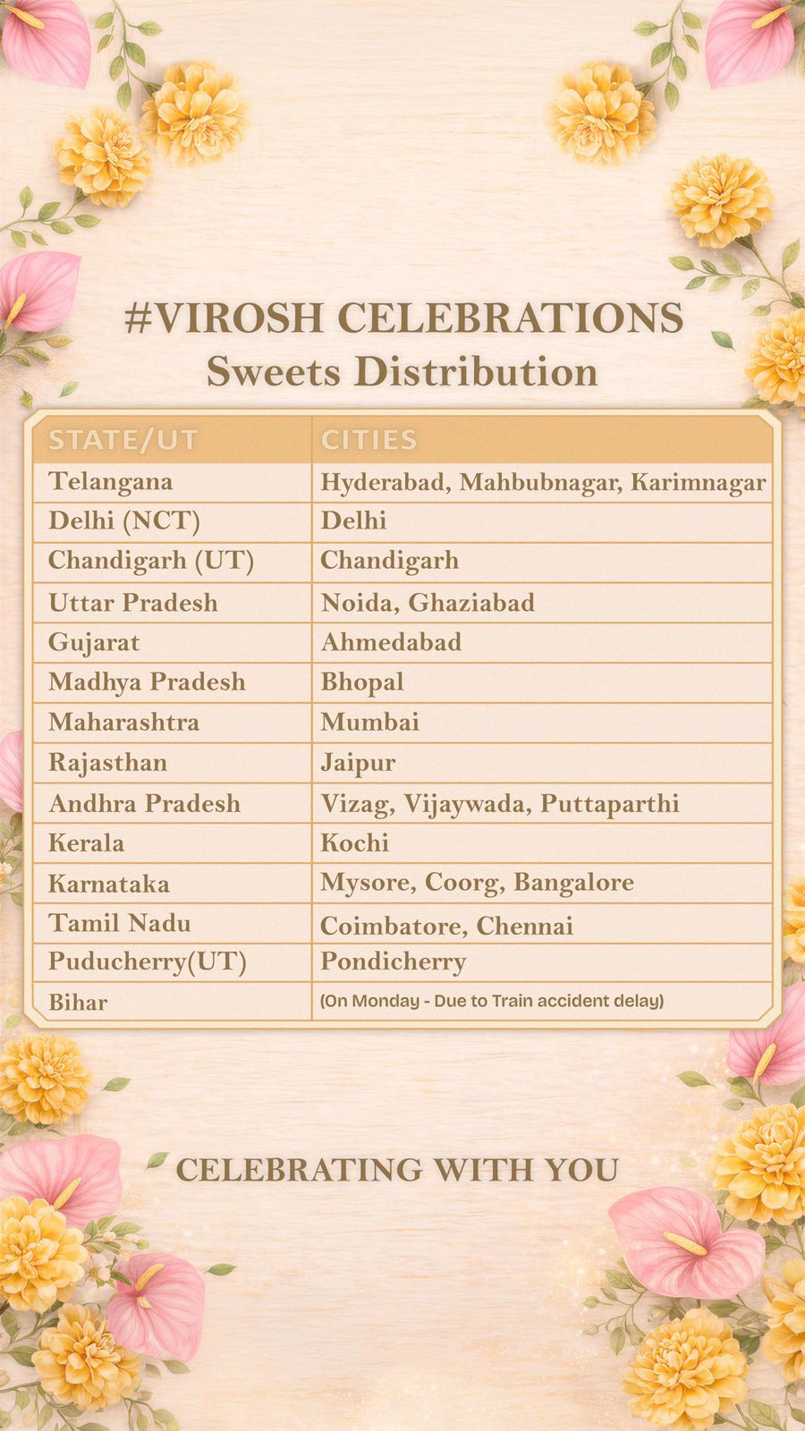 - 20కి పైగా నగరాల్లో స్వీట్స్ పంపిణీ