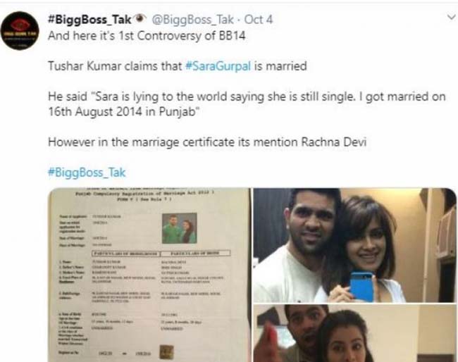 బిగ్ బాస్ 14లో తొలివారమే ఎలిమినేట్ అయి బయటకు వచ్చిన పంజాబీ నటి, గాయని సారా గుర్పాల్కు సంబంధించిన షాకింగ్ విషయం వెల్లడైంది. ఆమె హౌస్లోకి తాను సింగిల్ అంటూ వచ్చింది. కానీ ఆమెకు పెళ్లయిందనే విషయం ఆమె భర్త తుషార్ కుమార్ బయటపెట్టాడు. అతను కూడా పంజాబీ సింగరే. 2014లోనే తాము పెళ్లి చేసుకున్నామనీ, ఆమె తన వైవాహిక జీవితం గురించి అబద్ధాలు చెప్పి బిగ్ బాస్ కంటెస్టెంట్గా వెళ్లిందనీ అతను ఆరోపించాడు. తమ మ్యారేజ్కు సంబంధించిన కొన్ని పిక్చర్లను రుజువులుగా అతను షేర్ చేశాడు. అంతే కాదు, మ్యారేజ్ సర్టిఫికెట్ను కూడా బయటపెట్టాడు. అందులో సారా గుర్పాల్ పేరు రచనా దేవి అని ఉంది.