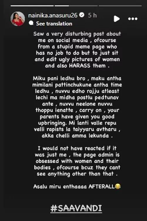 నైనికా అనసురు బుల్లితెర మీద అందరికీ పరిచయమే. బిగ్ బాస్ సీజన్ 8 ద్వారా బాగా ఫేమస్ అయ్యింది. అలాగే ఢీ డాన్స్ షోలో డాన్స్ ద్వారా బాగా పాపులర్ అయ్యింది. ఇక ఇప్పుడు బిబి జోడి సీజన్ 2 లో అమరదీప్ కి జోడిగా చేస్తోంది. అలాంటి నైనికా రీసెంట్ గా తన ఇన్స్టాగ్రామ్ స్టేటస్ లో ఘాటుగా ఒక పోస్ట్ పెట్టింది. "ఎలాంటి పని లేకుండా జస్ట్ కూర్చుని అమ్మాయిల చిత్రాలను ఘోరంగా ఎడిట్ చేస్తూ వాళ్ళను హరాస్ చేసే ఒక స్టుపిడ్ మీమ్ పేజీలో పోస్ట్ చేసిన నా చిత్రాలు నన్ను చాలా డిస్టర్బ్ చేశాయి. మీకు పని లేదు బ్రో, మాకు మిమ్మల్ని పట్టించుకునేంత టైం లేదు. నువ్వు మా మీద పోస్ట్లు పెడుతున్నావ్ అంటే నువ్వు నీలోనే తోపు ఐనట్టే..మీ పేరెంట్స్ నిన్ను బాగా పెంచారు. మీలాంటి వాళ్ళే రేపు రేపిస్టుల్లా తయారవుతారు.