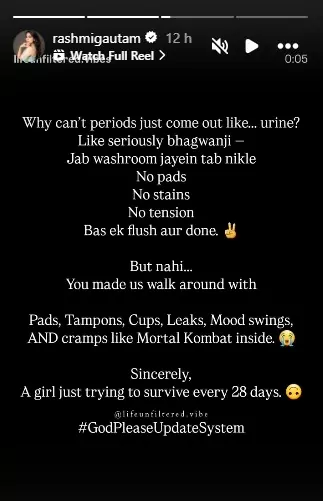 అప్పుడు ప్యాడ్స్ , మరకలు, టెన్షన్ లాంటివి లేకుండా ఒక్క ఫ్లష్ తో పీరియడ్స్ ఐపోయే అవకాశం లేదా ? దేవుడా నువ్వు మమ్మల్ని ప్యాడ్స్ చుట్టూ, మరకలతో, కడుపులో నొప్పితో, కప్స్ తో, మూడ్ స్వింగ్స్ తో మా లోపల్లోపల ఒక యుద్ధం జరిగేలా చేస్తున్నావ్. నిజం చెప్పాలంటే..ప్రతీ 28 రోజులకు ఒక అమ్మాయి సర్వైవ్ కావడం చాలా కష్టం..దేవుడా ప్లీజ్ అప్ డేట్ సిస్టం" అంటూ రష్మీ ఒక బాధ లాంటి నిర్వేదంతో ఈ పోస్ట్ ని పెట్టినట్టు తెలుస్తోంది. నిజంగా ఈ రోజున ఆడపిల్లలు మెచ్యూర్ ఐన దగ్గర నుంచి వీటి చుట్టూనే వాళ్ళ మైండ్ తిరుగుతూ ఉండాల్సిన పరిస్థితి వచ్చింది. ఆ విషయాన్నీ చాలా సూటిగా, స్పష్టంగా చెప్పింది రష్మీ. రష్మీకి సోషల్ ఇస్స్యూస్ మీద చాలా క్రేజ్ పోస్ట్స్ పెడుతుంది. అవి ఆలోచించే విధంగా ఉంటాయి. ఇక రష్మీ యాంకరింగ్ గురించి చెప్పక్కర్లేదు. ఆమె తెలుగు మాట్లాడే స్టైల్ కూడా డిఫరెంట్ గా ఉంటుంది.