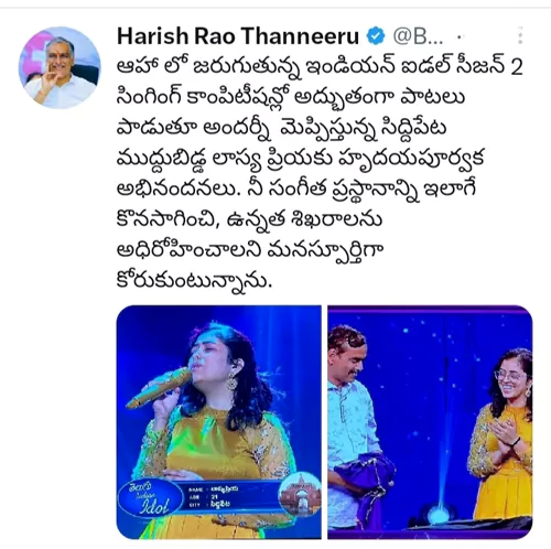 అయితే సిద్దిపేట మంత్రి హరీష్ రావు లాస్య ప్రియ గురించి తన ట్విట్టర్ లో ట్విట్ చేసాడు. ఆహా లో జరుగుతున్న ఇండియన్ ఐడల్ సీజన్- 2 సింగింగ్ కాంపిటేషన్లో అద్భుతంగా పాటలు పాడుతూ అందరిని మెప్పిస్తున్న సిద్దిపేట ముద్దుబిడ్డ లాస్యప్రియకు హృదయపూర్వక అభినందనలు. నీ సంగీత ప్రస్థానాన్ని ఇలాగే కొనసాగించి, ఉన్నత శిఖరాలు అధిరోహించాలని మనస్ఫూర్తిగా కోరుకుంటున్నానని హరీశ్ రావు ట్వీట్ చేశారు. దానికి లాస్య ప్రియా హ్యాపీగా ఫీల్ అవుతూ.. ఆ ట్వీట్ ని తన ట్విట్టర్ పేజీలో షేర్ చేసింది. ఇలా హరీశ్ రావు గారు నా పాటలని గుర్తించి నన్ను ప్రోత్సాహించినందుకు చాలా సంతోషంగా ఉందంటూ ట్విట్టర్ ద్వారా తన ఆనందాన్ని పంచుకుంది లాస్యప్రియ. దీంతో ఈ పోస్ట్ నెట్టింట వైరల్ గా మారింది.