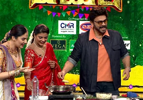 "ఈ సంక్రాంతికి వస్తున్నాం" అనే మూవీ ఏ ముహూర్తాన మొదలుపెట్టారో కానీ ఆడియన్స్ అందరినీ తెగ అలరించేసింది. ఇక ఈ మూవీ టీమ్ మొత్తం కూడా స్టార్ మాలో ప్రసారమైన "ఈ సంక్రాంతి వేడుక" షోకి వచ్చారు. మొదటిసారి బుల్లితెర మీద ఇలాంటి ఒక షోకి వచ్చి వెంకటేష్ ఆడియన్స్ ని అలరించారు. ఇక హీరోయిన్ ఐశ్వర్య రాజేష్, డైరెక్టర్ అనిల్ రావిపూడి, భీమ్స్ సిసిరోల్ కూడా వచ్చారు. ఇక వెంకీ మామతో శ్రీముఖి ఎన్నో విన్యాసాలు చేయించింది. వెంకీ మామ కూడా ఫుల్ ఎంజాయ్ చేసారు. అలాగే సీనియర్ నటులు, ట్రెండింగ్ నటులు చెప్పిన తీన్ మార్ డైలాగ్స్ ని వెంకీ మామ చాల శ్రద్దగా విని మరీ ఎంజాయ్ చేశారు. ఇక దీపికా రంగరాజు వెంకీ మామనే ఆట పట్టించింది. అలాగే వెంకీ మామ ఐశ్వర్య రాజేష్ ఫేస్ కి కళ్ళు పెయింట్ చేసి డాన్స్ చేశారు. ఆ తర్వాత వెంకీ మామతో శ్రీముఖి గారెలేయించేసింది. వెంకటేష్ కూడా చాలా స్పోర్టివ్ గా వచ్చి గారెలు వేశారు. ఇక స్టేజి మీద ఉన్న అందరి ఆనందం అంతా ఇంతా కాదు.