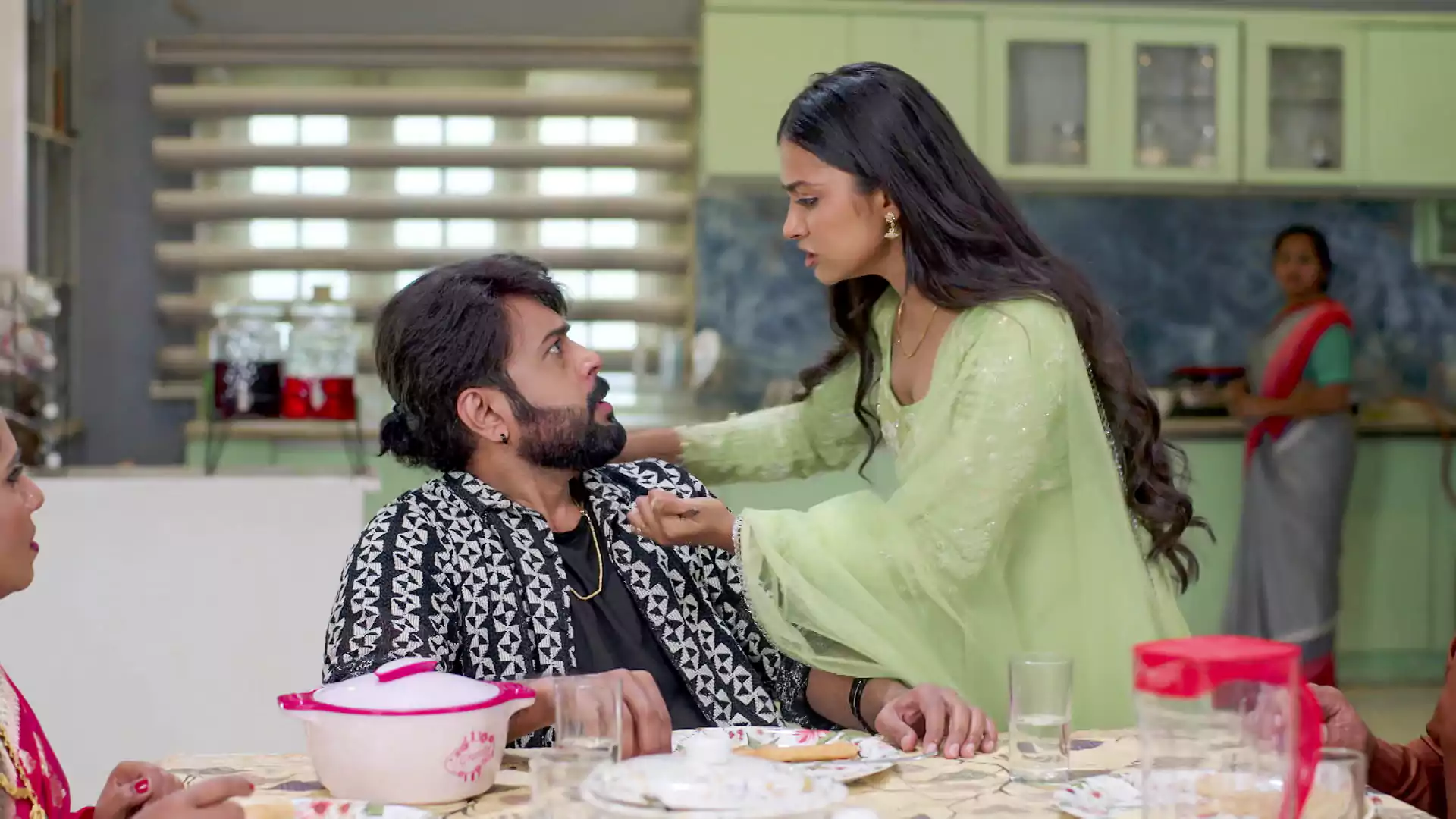 అతన్ని చూసి భూషణ్ కోప్పడుతాడు. వీడు ఇక్కడ ఉన్నాడంటే ఆ అమ్మాయి కూడా ఇక్కడే ఉంటుందని చక్రి అనుకుంటాడు. నువ్వు ఇక్కడ ఏం చేస్తున్నావని భూషణ్ కోప్పడుతాడు. డ్రైవర్ గా వచ్చానని చక్రి అనగానే అంటే డాడీ పంపింది ఇతన్నే అనుకుంటానని ఆది అంటాడు. వీడు నాకు ఇష్టం లేదని భూషణ్ అంటాడు. అప్పుడే మహా వస్తుంది. ఈ అమ్మాయి కోసం అయిన ఇక్కడే ఉండాలని.. సారీ సర్ నిన్న నా మిస్టేక్ అని భూషణ్ ఇగో సాటిస్ఫాక్షన్ అయ్యేలా మాట్లాడుతాడు. దాంతో భూషణ్ ఒప్పుకుంటాడు. వాడిది తప్పు అయినా అతనికి తప్పు అనేలా చేసాడని మహా అనుకుంటుంది. ఆ తర్వాత అందరు టిఫిన్ చేస్తారు. మహా చేత్తో తింటుంటే ఎందుకలా తింటున్నావ్.. కెనడాలో అలా తింటే నవ్వుకుంటారని భూషణ్ అనగానే మహాకి ఇంకా కోపం వస్తుంది.