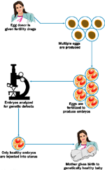 Once an older woman has managed to get pregnant and hold on to her foetus, she must face that women over 40 have a greater chance of giving birth to defictive child. True, most birth defects can now be detected by amniocentesis (a procedure that extracts amniotic fluid from the mother's womb during the 14th or 15th week of pregnancy), and a defective foetus can be aborted.