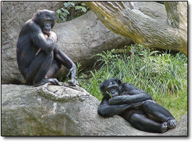 They're also not monogamous, not by a long shot. And here's where it gets interesting: When female bonobos are screwing around, they make lots of noises, not because they're having a good time, but so the other males in the vicinity will hear them. It's a mating call. An invitation. An alert to the other boys in the area that it's party time and she's open for business.