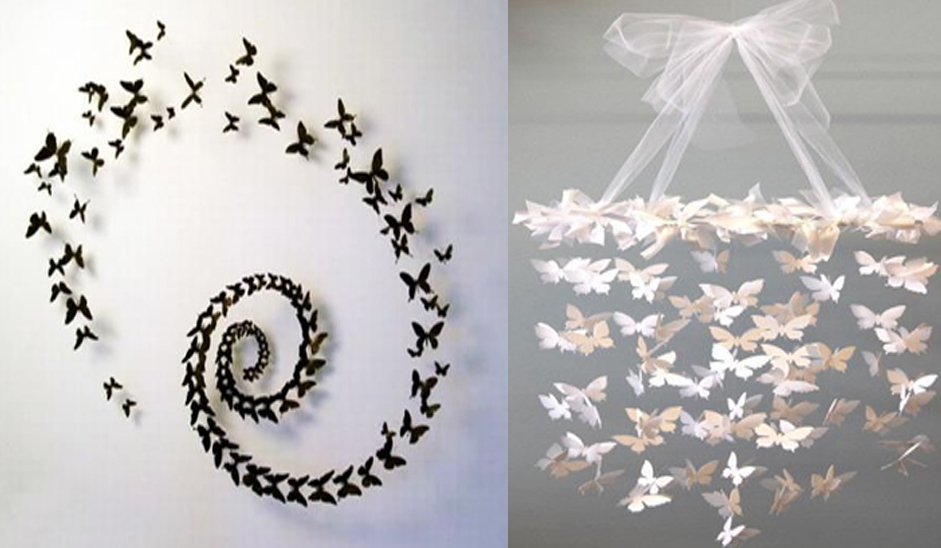 Draw a palm size butterfly and cut it to shape. Then fold like an accordion and tie with a thread or wire at the center. Your fancy butterfly is ready, you can even keep it as is without folding. As shown in the pictures, we can paste our butterflies to decorate any item. Many artists have created chandeliers, Crib Mobiles, Canvas board art, greeting cards, paper curtains etc., using the same butterflies. There are paper cutters and stencils that are in butterfly shapes available in the market, with these cutting numerous pieces for a large craft project becomes easy. Such a project is perfect for a school craft class too. They decorate any space perfectly and are forever beautiful! Who says butterflies dont stay longer?