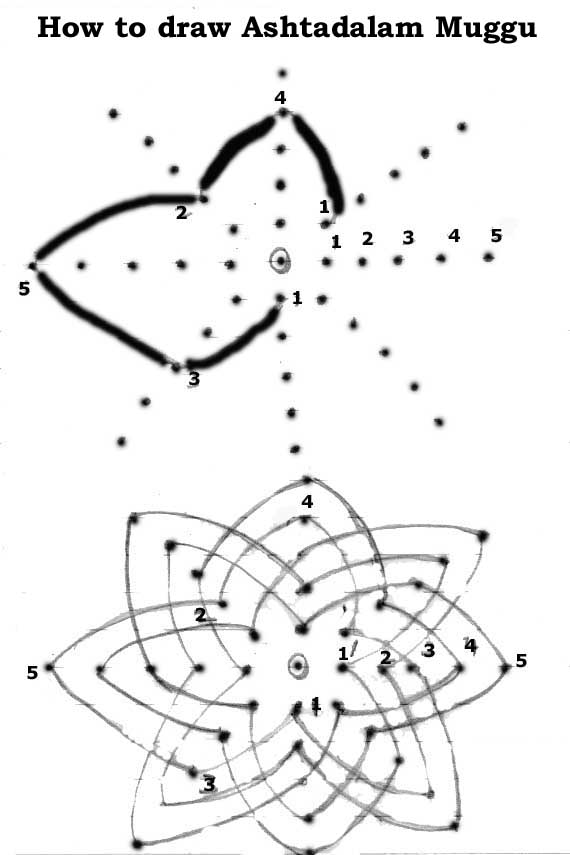 The Ashtadalam Muggu is a high energy Muggu or design especially meant for Lakshmi Poojas. This Muggu is specifically drawn on Fridays and during the Shravana Masa Lakshmi Pooja day ,i.e. Varalakshmi Vratham day.