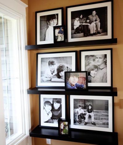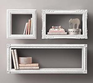 Shadow boxes or Picture frames can be converted into floating shelves for photo display. This idea can be used for book shelves and general storage too. Many home decor stores are selling these in sets for easy installation, and quite good carpenters can make these on custom orders. Even floating shelves are available in a wide range, they are easy to install without any professional help. Some deep, so long, some wide,..in various colors and choices are available over the counter.