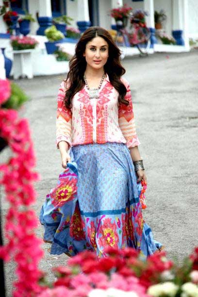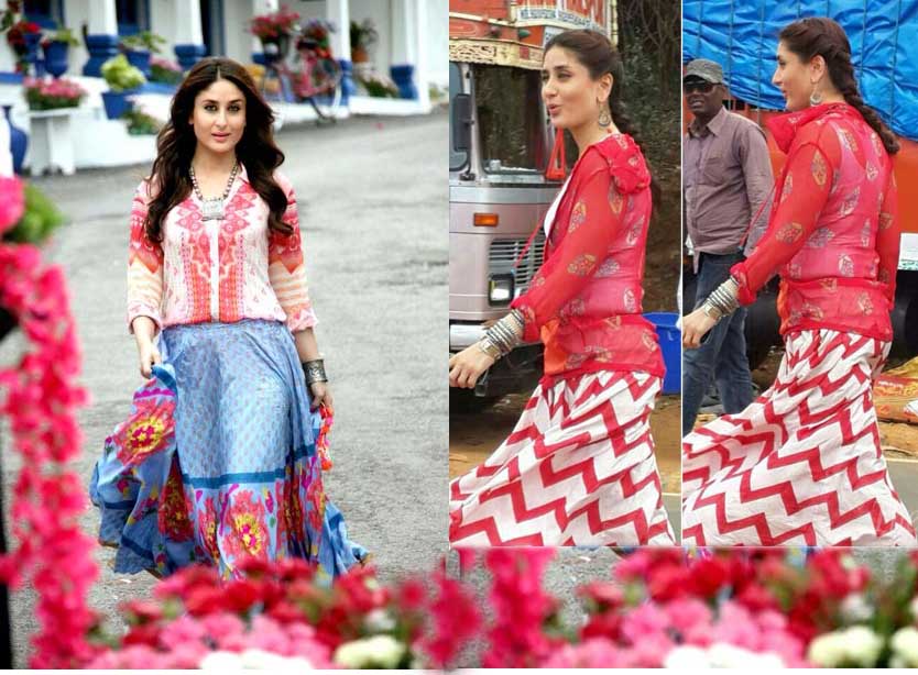 Kareena's Style File:Check Out Kareena Kapoor’s new look in Singham 2! We simply love her bold and beautiful style with those bright and contrasting colors and floral prints. Seen mostly in flowy divided skirts and full length skirts with short shirt tops as seen in the promos she has brought out this old fashion of the 90’s again this time with brighter prints and crushed fabric.