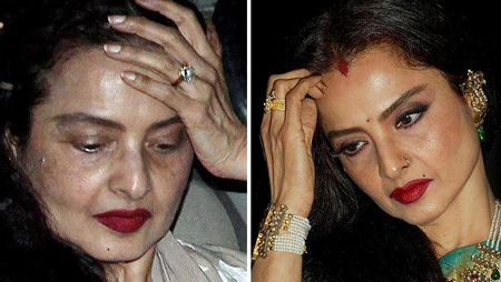 When we see the picture of Rekha we can’t help but admire this ageless beauty. But this beauty also has a few secrets in her makeup kit to hide the flaws in her skin.If you look at the picture above you can see the difference.