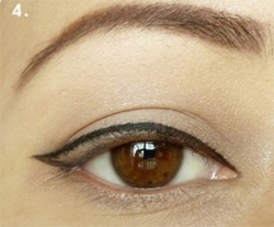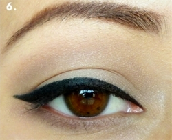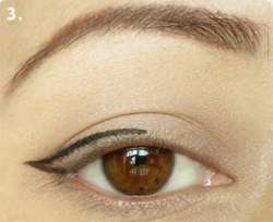 STEP 4: After drawing the wing, draw a line back to your upper lash line. This should create an empty triangle on your upper lid. To make you eyeliner thick, draw a bigger triangle, ending at the middle part of your lash line.