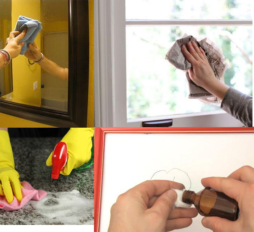 * To clean mirrors: Use a small spray bottle and fill with rubbing alcohol, spritze the mirror with it when cleaning for a streak-free look.