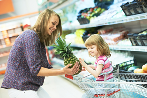 Before you go in, remind your child of the rules and what is expected of him in the store. Let him know he's going to be secured in the cart (letting him sit in the back or stand on the cart is dangerous) or expected to hold your hand as you walk through the store. You can try to make the experience more fun by involving your child in the shopping: asking him which cereal/fruit he would like, if he would like to hold the cereal/fruits, etc. For each privilege he gets (for example, choosing his own cereal) link it to his wonderful behavior right now. And if he begins to tantrum? "Look away and ignore until the tantrum is over". "Don't worry about what other people in the store think--they're just happy it isn't their child at that moment!".