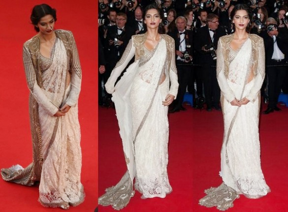 Last year also she wore an old-world white and gold creation by designer Anamika Khanna again , made extra-special by a trailing baroque-effect jacket and accessorised her glamorous outfit with the simplest of ornament - an outsized nose ring - and a classic winged eyeliner and deep red lips to complement the outfit. Both ways the sarees that Sonam wears are truly enchanting and a trendsetter for the red carpet events.