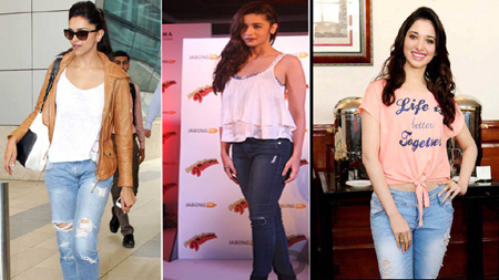 Worn on and off in the past 3 years these shredded jeans look uber cool and can be worn either with a tied plain T shirt like how Tamannah wore it , or check out Alia Bhatt who is seen in skin tight shredded black jeans with printed bustier and white layer top and heels.