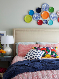 CIRCLES ON WALLS Blank walls make for cold and unwelcoming spaces. Happily, you can easily and inexpensively add warming layers of color and pattern. And Circles are hot now! Suspend a collection of vivid dishes that match your aesthetics; Group artworks that share a theme or color scheme; display colorful stitch frames as-is on walls, you don't need to frame them separately; If you are in your own house not a rental, then think of a beautiful wall paper in circular pattern.