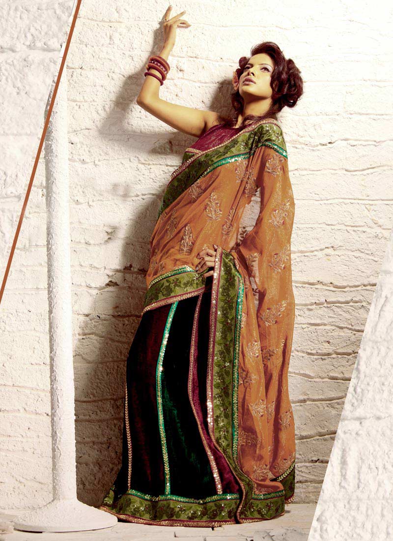 Lovely lehenga style saree featuring alternate panels of dark green and brownish maroon shade velvet patches accentuated with maroon and green shade patch borders. Saree features leafy patterns embellished with zari and sequins.