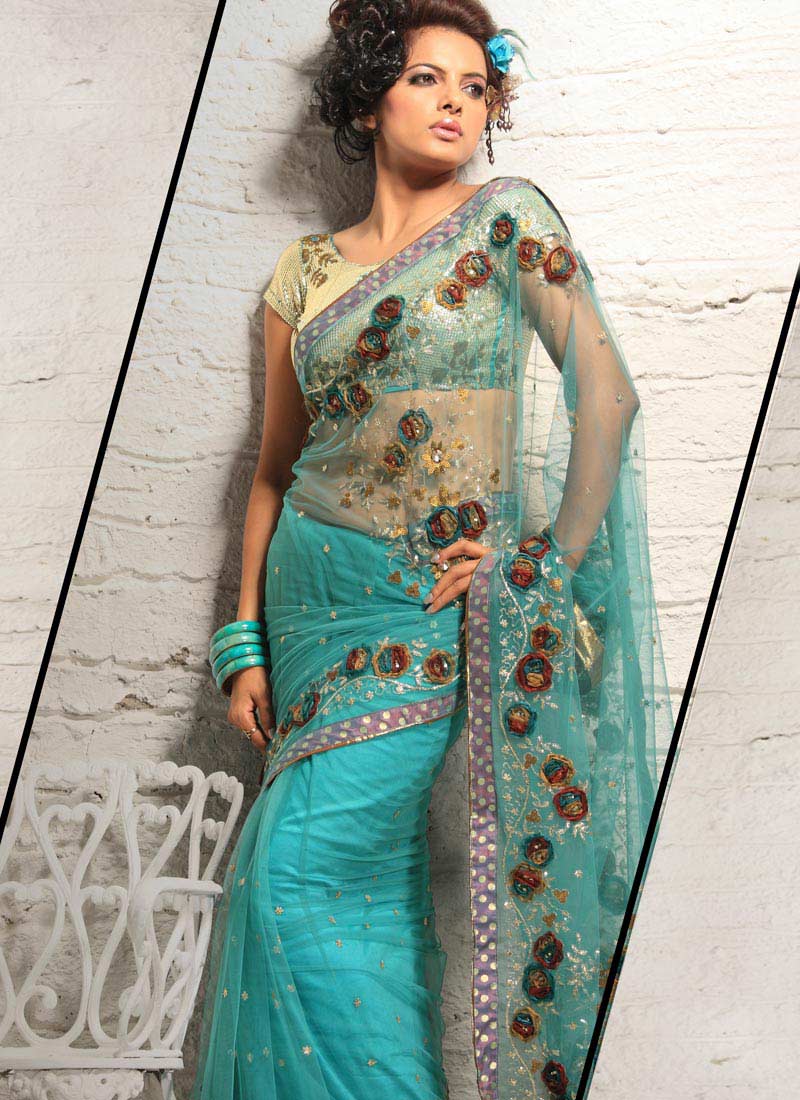 Dull teal blue shade saree featuring sequins buttis along the lower part and pallu. Lower part along the border features fancy appliqued floral patterns embellished with sequins, fancy thread, beads and zari. Border features a fancy maroon shade patch with polka dots accentuated with a gota patch border.