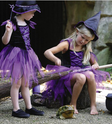 A stunning witch costume with a black velour leotard style bodice, the purple shimmer inset is finished with black criss-cross ribbon and the shoulder straps with black marabou.