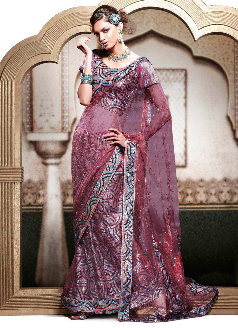 Dark mauve shade lehenga look saree featuring small sequin butties and a fancy patch border enhanced with sequin work.Pallu features vertical patces richly embellished with sequins.